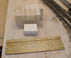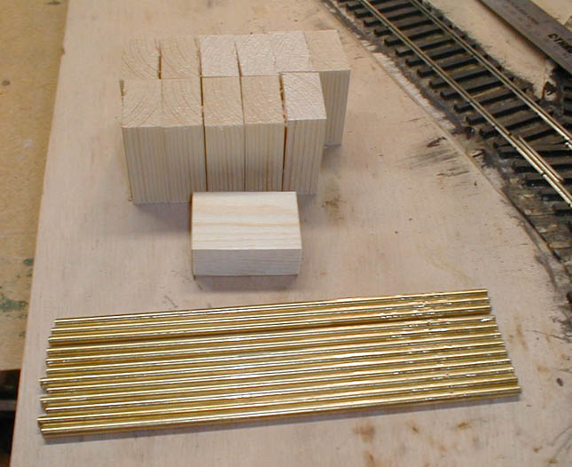 After cutting the rods to 8" lengths, I drill a #60 (size not critical) hole about 1 1/4" from the top. I use a file to lightly bevel the edges at the top, not so much for prototypical appearance but to avoid catching my clothing on it when working on or running the module. Many folks like to cut the top at an angle to represent the way wooden poles on some lines were shaped. Since the top of the module was made with only 1/4" plywood (and no homasote) I need to give the poles something more substantial for a mounting base. I used a scrap piece of 1x2 lumber and cut it into a dozen pieces each about 2 1/2" long. These blocks are then glued to the underside of the module at the point where each line pole will site. Rather than going to the bother of threading each pole and using washers and nuts to mount them, I simply drill a hole slightly smaller than 3/16" hole and hammer the poles in.